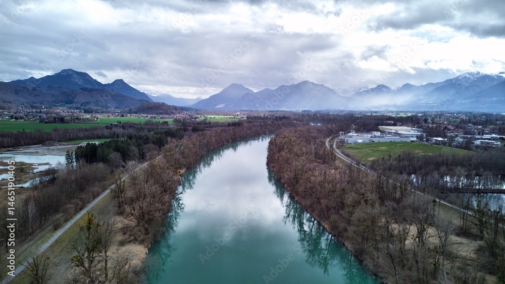Bavaria in spring. Aerial view of mountains, Alpine foothills, river, and spring forest. Sky with sun and clouds, bluish-green water, trees without leaves. Drone photo.
