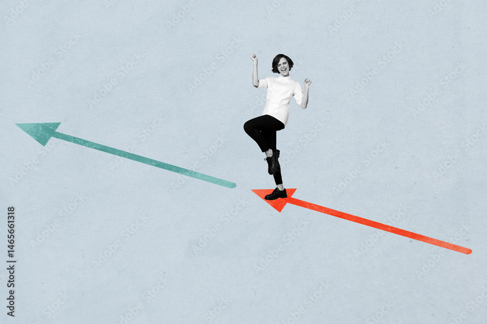 Creative zine image artwork collage of happy businesswoman stand arrow development career promotion opportunity chance pointer