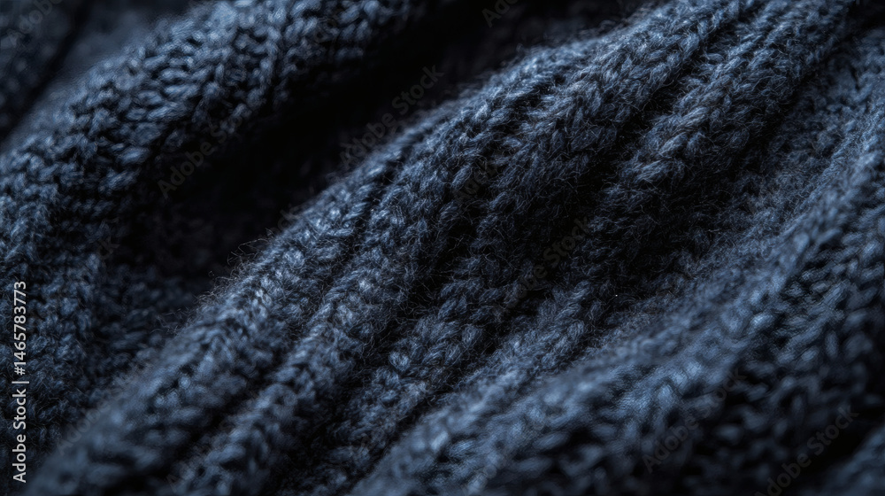 A close-up shot reveals the intricate details of a dark blue knitted fabric.