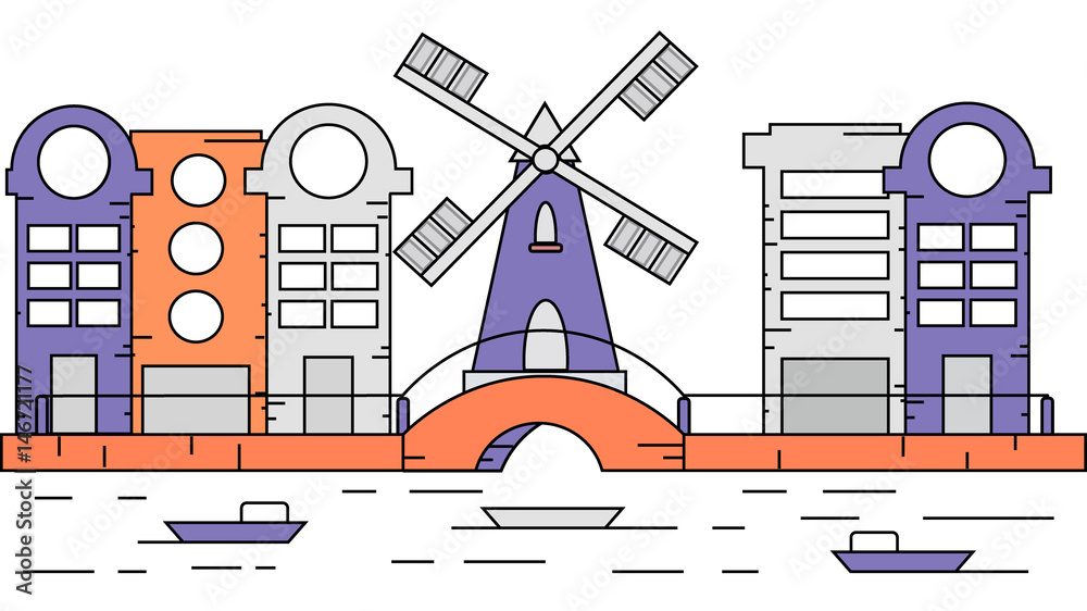 Amsterdam city in flat line trendy style. European old town. Mill. City landscape. Flat design style.