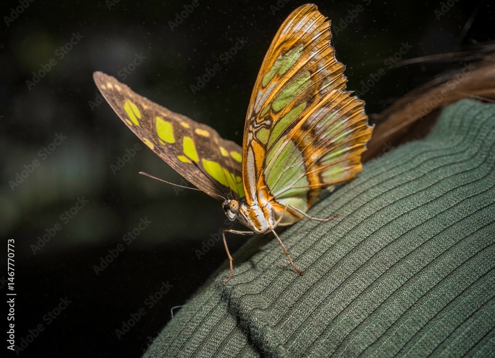 Close-up image of a Malachite butterfly (Siproeta stelenes) perched on a ribbed green fabric surface. The butterfly’s striking lime green and orange patterned wings are shown in sharp detail.