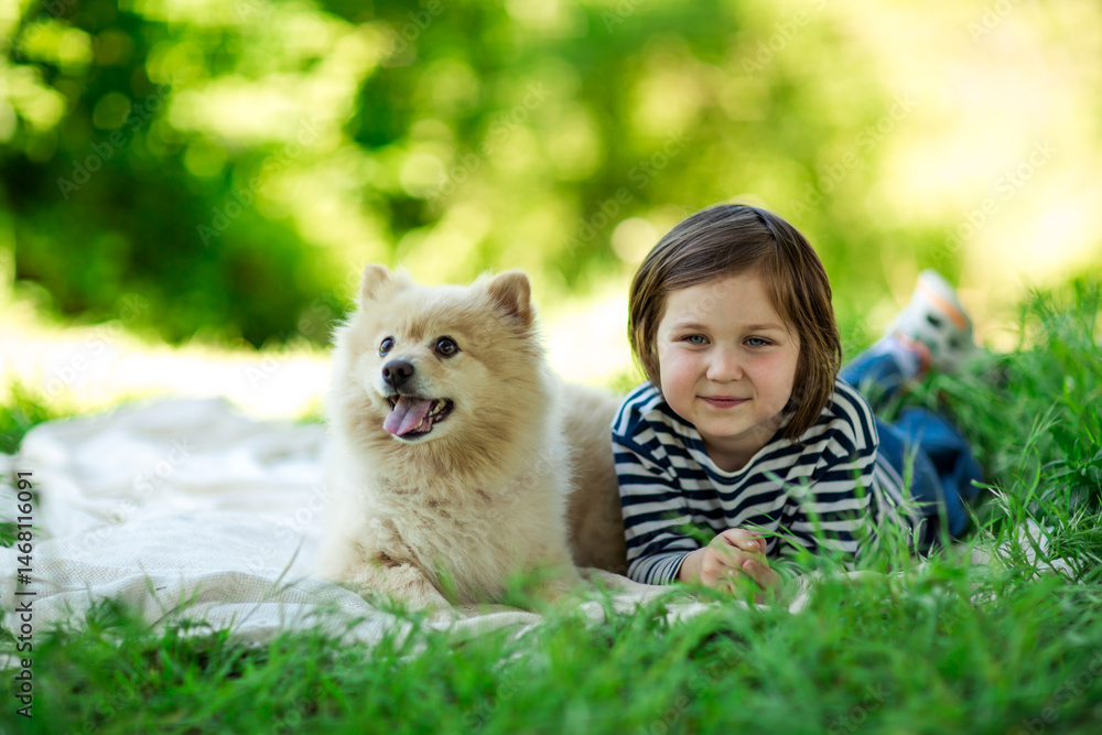 Beautiful girl with a Pomeranian dog