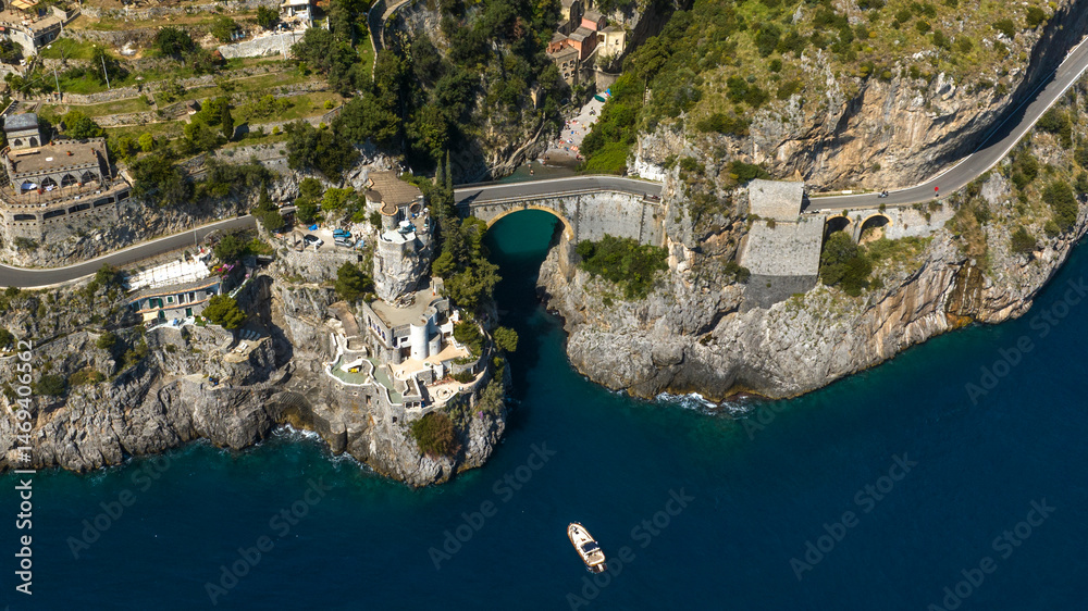 Aerial view of the Furore fjord bridge, a small hidden treasure of the Amalfi Coast, in the province of Salerno, Campania, Italy. The road that crosses it is the Amalfi Drive.