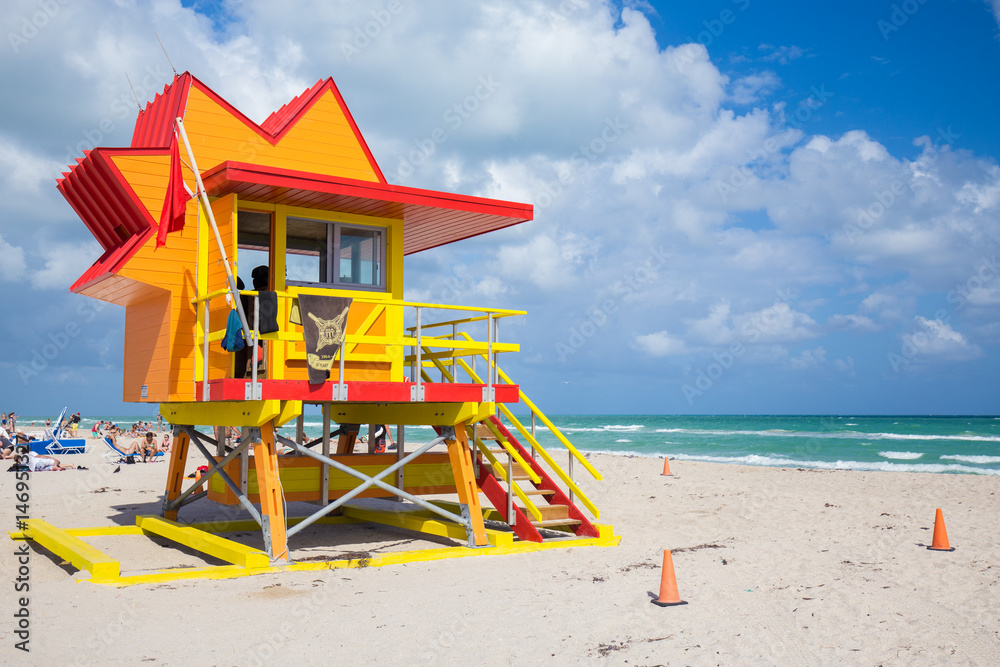 USA. FLORIDA. MIAMI BEACH, APRIL,2017: Miami Beach in South Beach with new lifeguard tower and coastline with colorful cloud and blue sky. Florida.