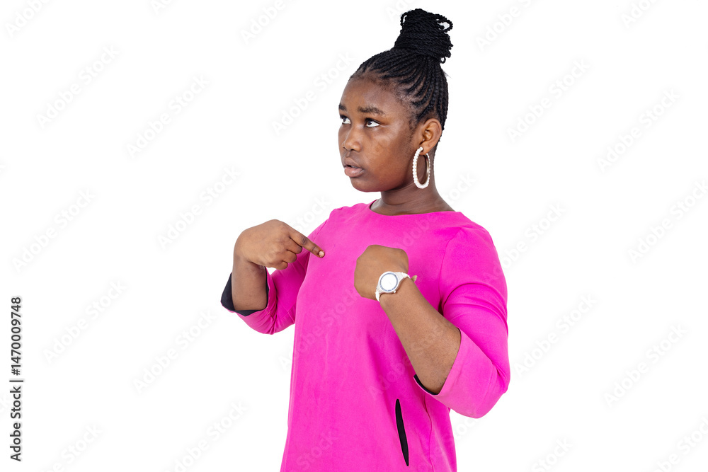 young girl in pink camisole standing on white background pointing fingers at herself looking up.