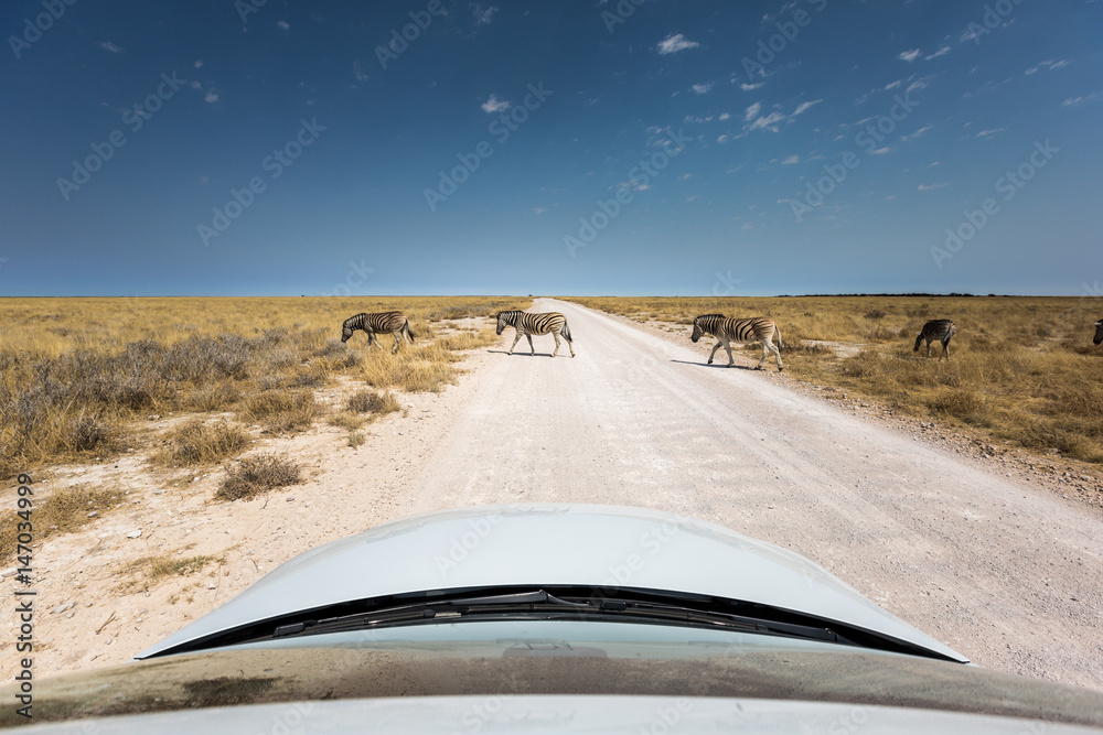 Zebra crossing in front of a car during a safari in the Etosha National park, Namibia
