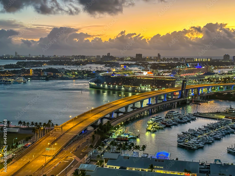 Night aerial view on MIami Port bridge, Miami, Florida, USA