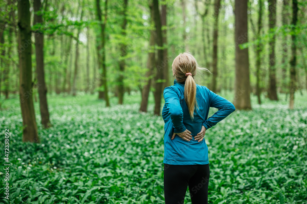 Woman feeling lower back pain while jogging in forest. Runner stretching preventing backache during fitness activity