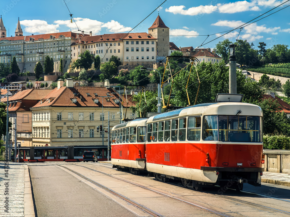 A red tram on the street as historic buildings on background in Prague, Czechia.