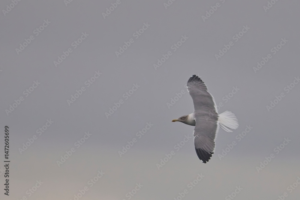 Azorean Yellow-legged Gull, a subspecies of the Yellow-legged Gull, (Larus michahellis atlantis), adult in flight, wings spread, Newlyn, Cornwall, UK.