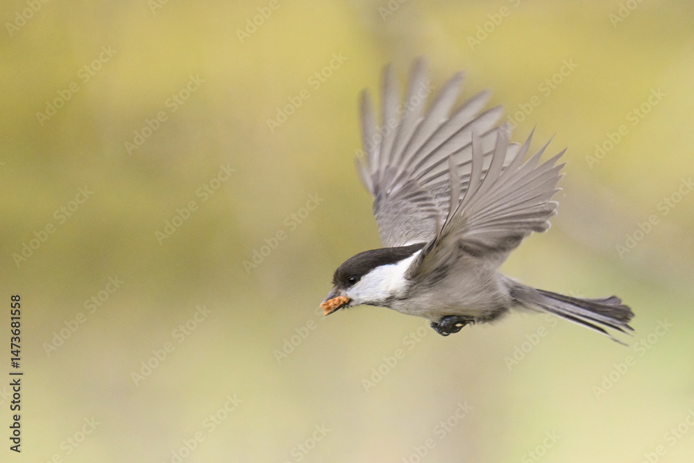 Willow tit (Poecile montanus) in flight with spread wings and the beak full of nest sawdust, against bright background , Alps. May