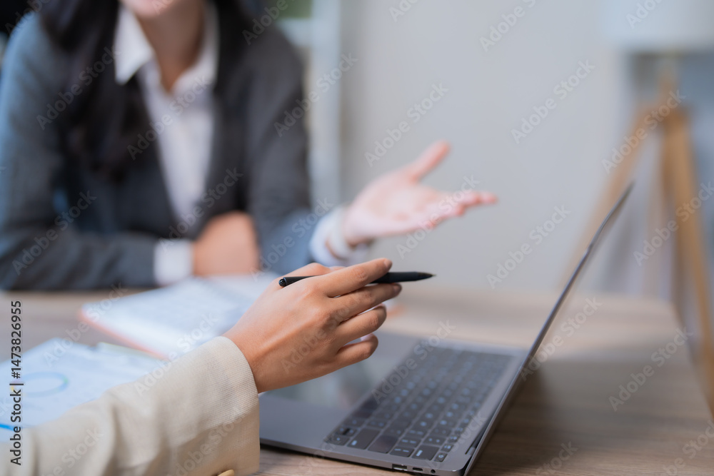 Two businesswomen are having a discussion using a laptop and documents, actively collaborating on a project or sharing insights in a professional setting