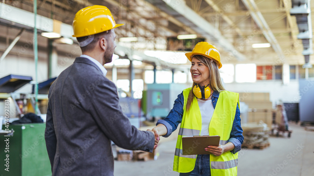Construction Professionals Shaking Hands in Industrial Setting With Safety Gear and Equipment