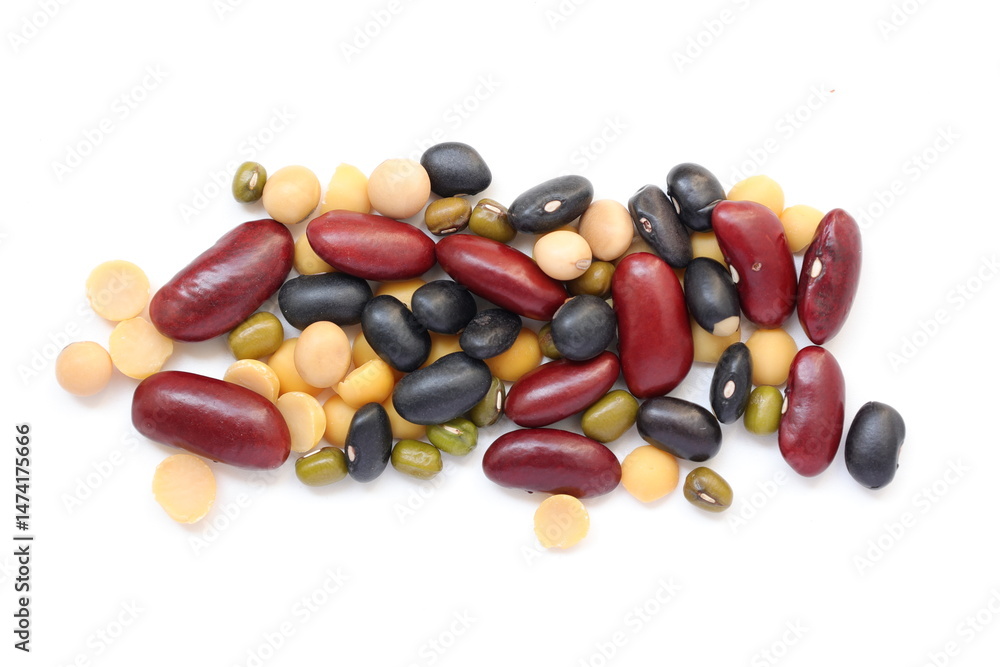 Top view of Red beans black beans soybean with mung bean isolated on white, isolated of Red beans black beans soybeans with mung bean