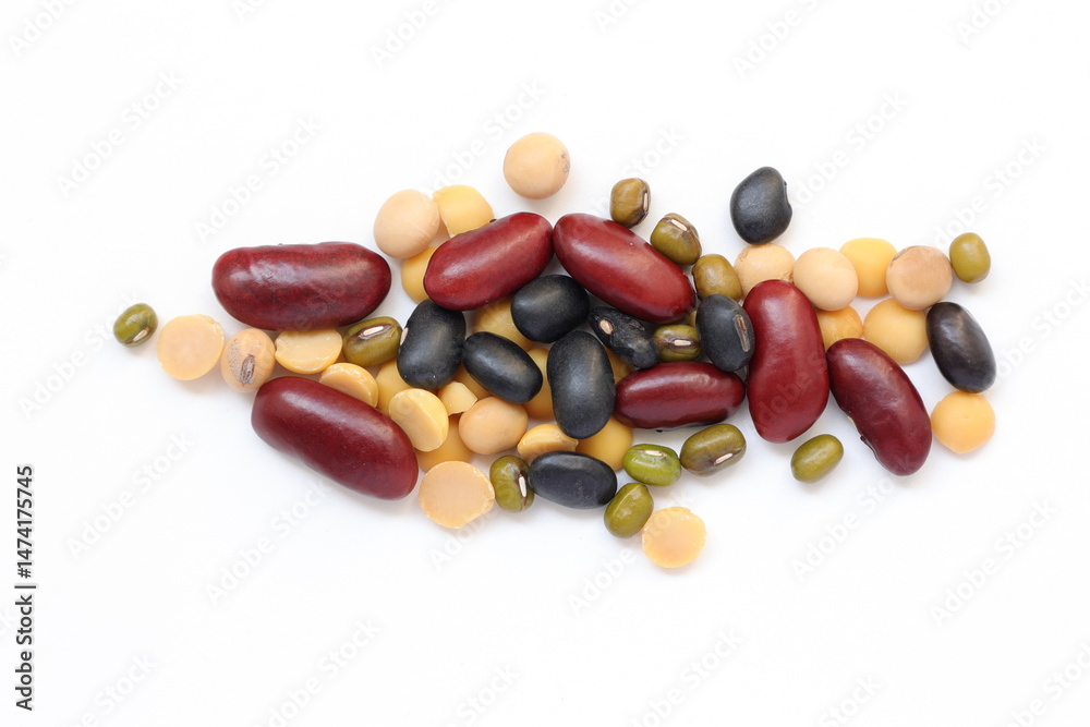 Top view of Red beans black beans soybean with mung bean isolated on white, isolated of Red beans black beans soybeans with mung bean