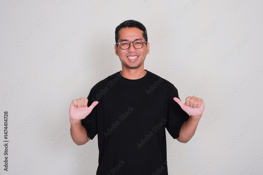 A man smiling proud while pointing at his plain black t'shirt that he wear
