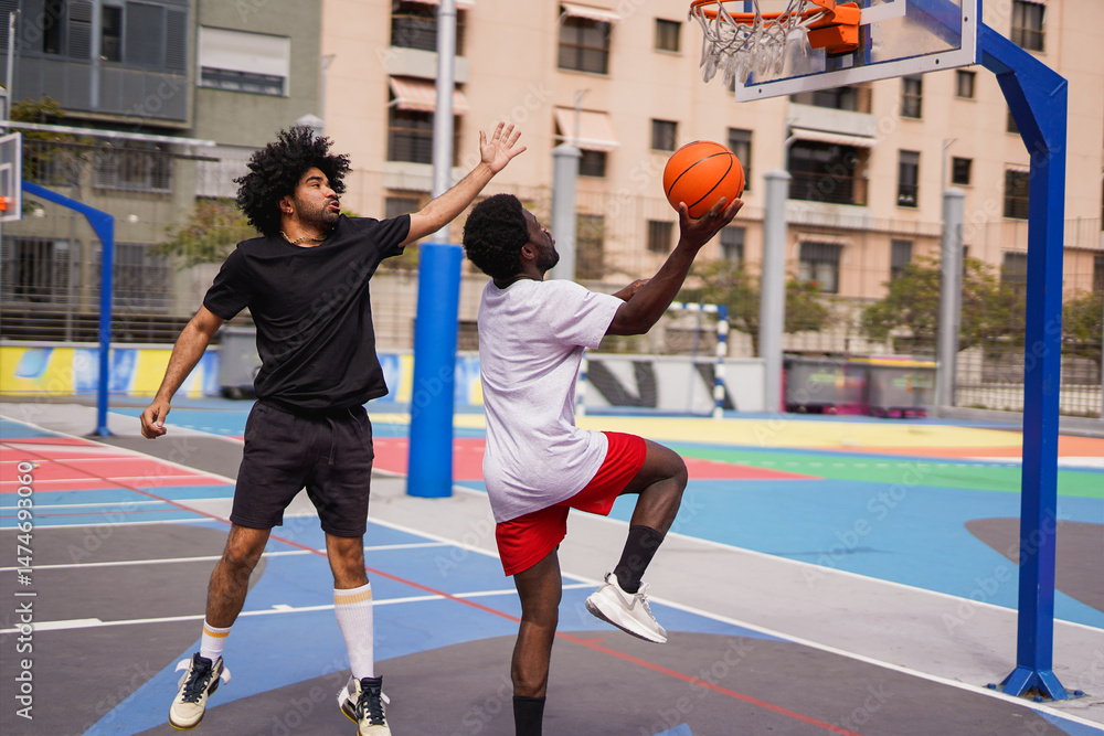 African men playing basketball in the city during summer time - Sport, urban lifestyle and young people concept