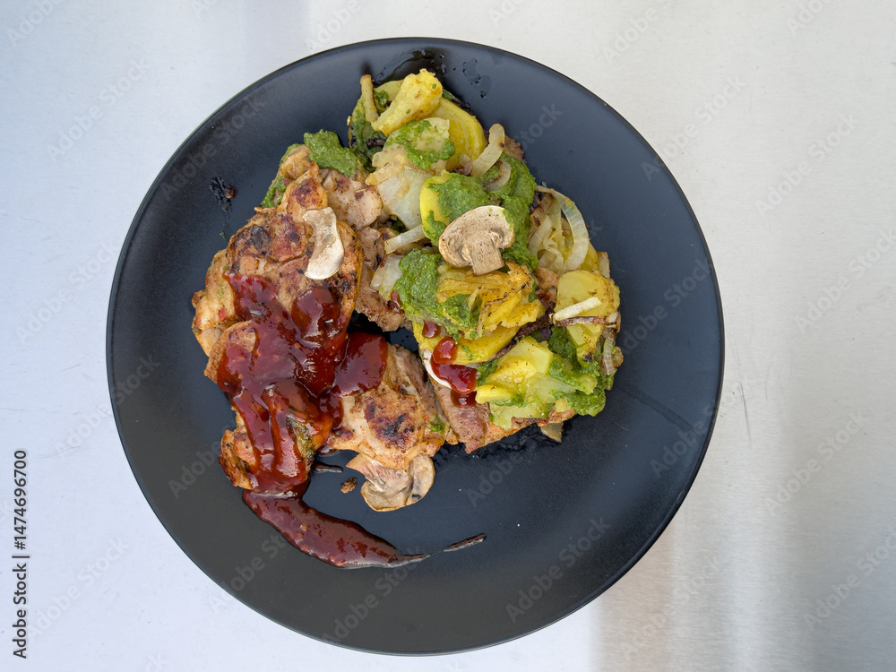 Delicious grilled chicken breast served with herb roasted potatoes, mushrooms, and a tangy BBQ sauce.