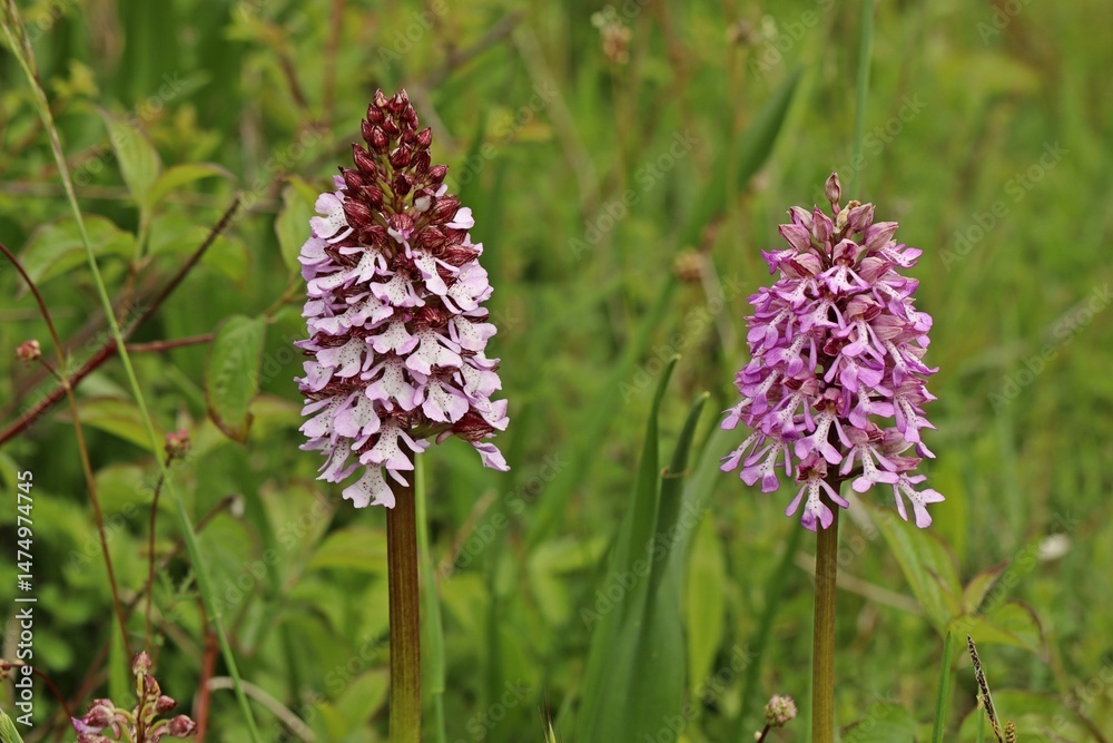 Purpur-Knabenkraut (Orchis purpurea) und Hybride mit Helmknabenkraut nebeneinander