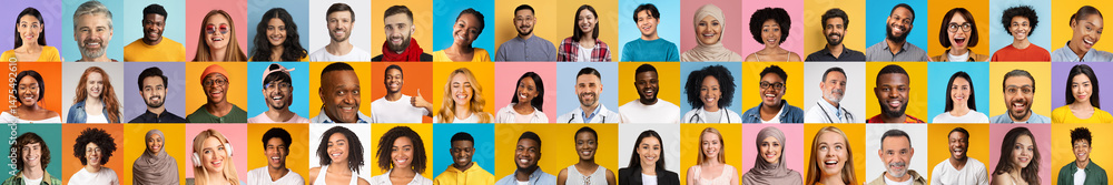 Faces of diverse individuals showcase a vibrant collage reflecting unity in culture and lifestyle. Each portrait captures unique expressions against colorful backgrounds, celebrating togetherness.