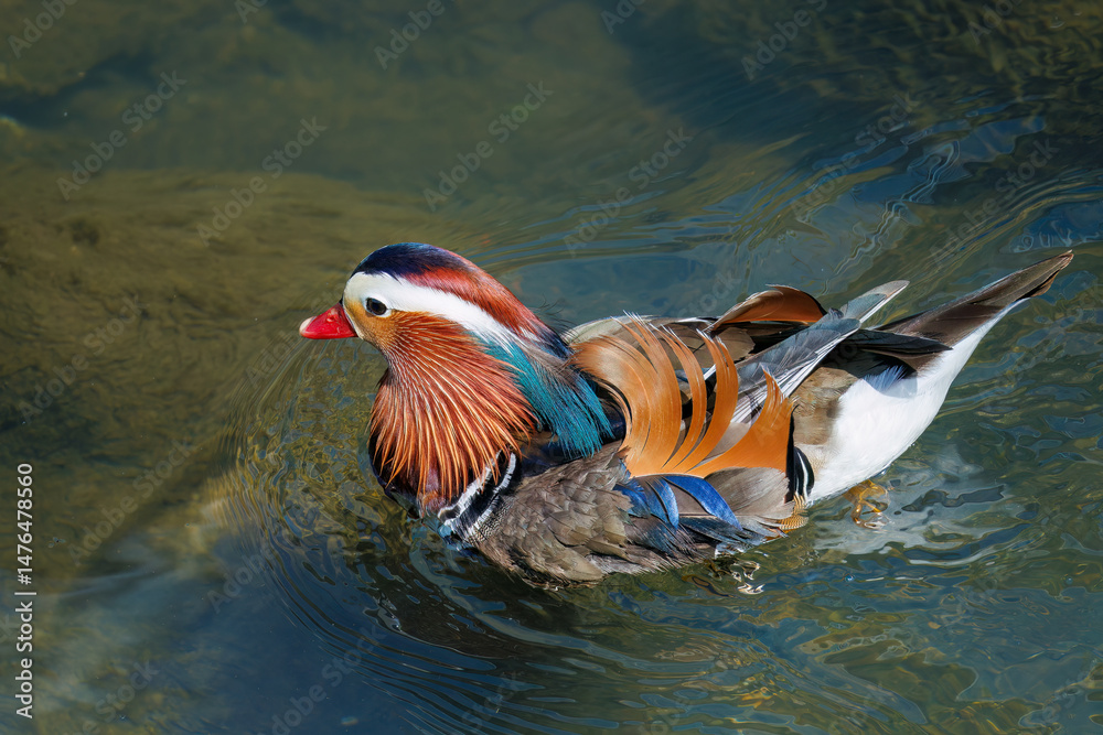 美しいオシドリ(カモ科) 英名学名:Mandarin Duck, Aix galericulata クレソン(アブラナ科)やフキ(キク科)が生える美しいせせらぎ。 二ヶ領用水中原区川崎市神奈川県-2025