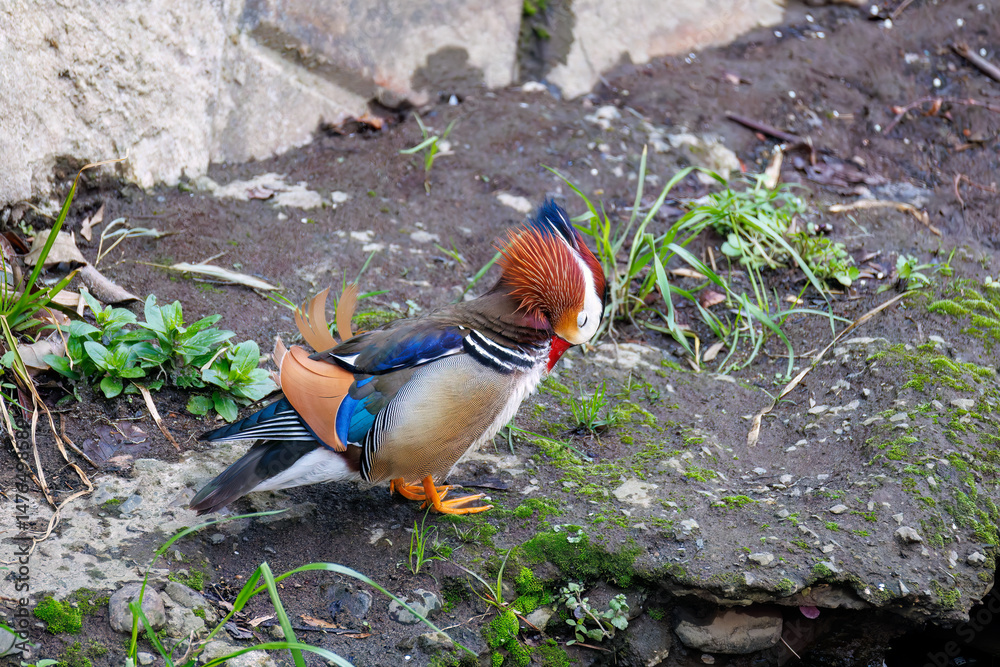 美しいオシドリ(カモ科) 英名学名:Mandarin Duck, Aix galericulata クレソン(アブラナ科)やフキ(キク科)が生える美しいせせらぎ。 二ヶ領用水中原区川崎市神奈川県-2025