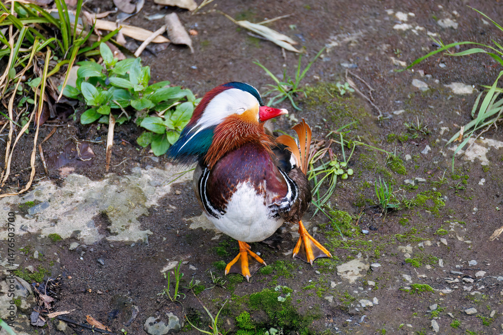 美しいオシドリ(カモ科) 英名学名:Mandarin Duck, Aix galericulata クレソン(アブラナ科)やフキ(キク科)が生える美しいせせらぎ。 二ヶ領用水中原区川崎市神奈川県-2025
