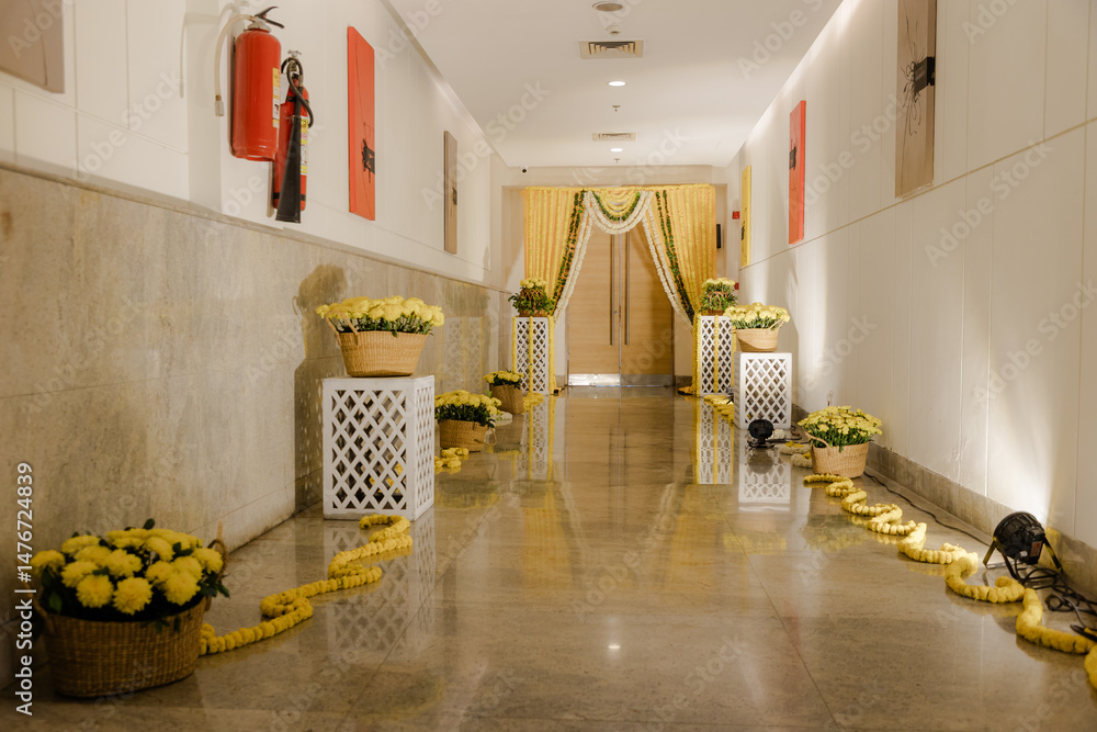 Hallway decorated with yellow flowers and garlands, leading to draped entrance, creating a festive and elegant atmosphere.