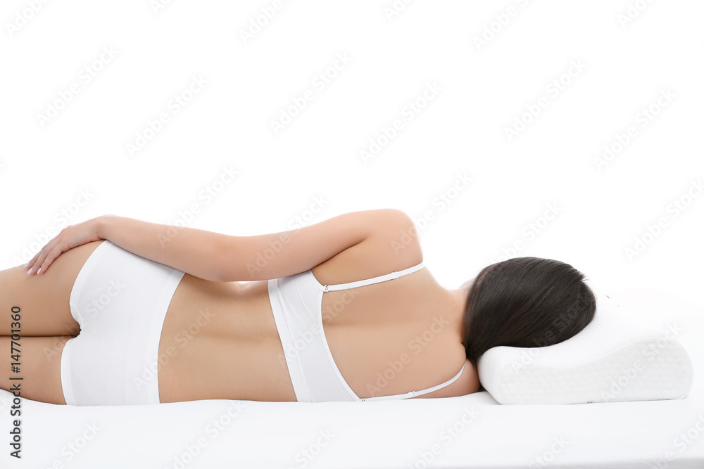 Young woman lying on bed with orthopedic pillow against white background. Healthy posture concept