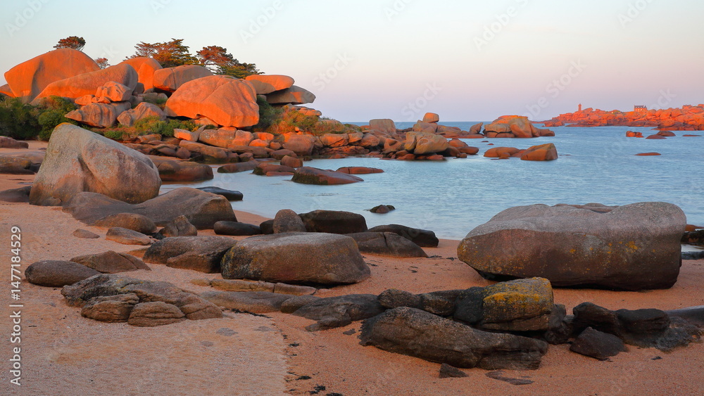 The Cote de Granit Rose (Pink Granite Coast) at Renote Island, Tregastel, Brittany, Cotes d'Armor, France, with pink rocks of various shapes