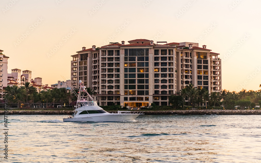 Yacht go to marina. Boating and yachting. Luxury lifestyle. Yacht at Fisher island luxury residential building. Vacation on summer. Fisher island building. Luxury motor boat yacht. Touristic spot