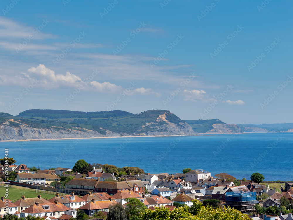 Overview of Lyme Regis buildings across Lyme Bay and the Jurassic coastline