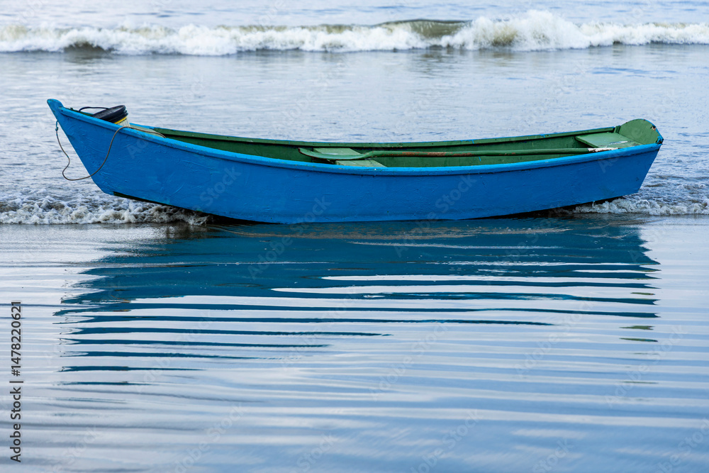 Small blue fishing boat on the beach of Pereque in Guaruja, coast of Sao Paulo state, Brazil