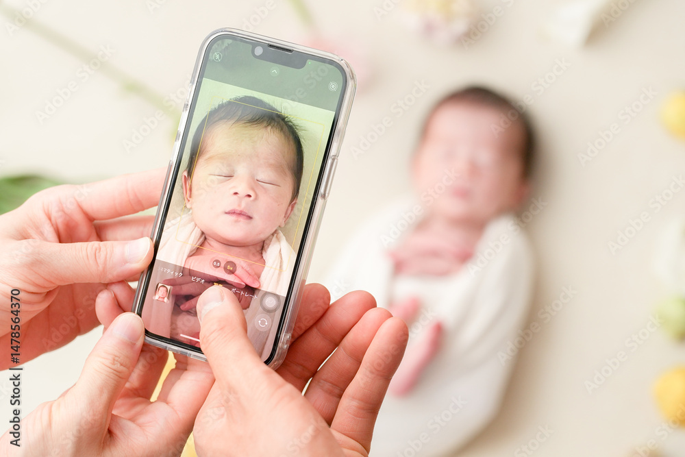 A 7-day-old Japanese newborn sleeps in a white swaddle, surrounded by spring flowers on a white background. The parents take a photo with a smartphone to save this gentle memory of new life and love.