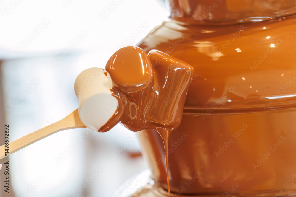 豪華なチョコレートファウンテン。 食べ放題ビュッフェ会場。 多くの食材が春の桜の花のディスプレイの下に置かれている。 富士山を一望できる展望レストランでお昼の食べ放題ビュッフェを食べる。 山梨県富士吉田市 - 2025