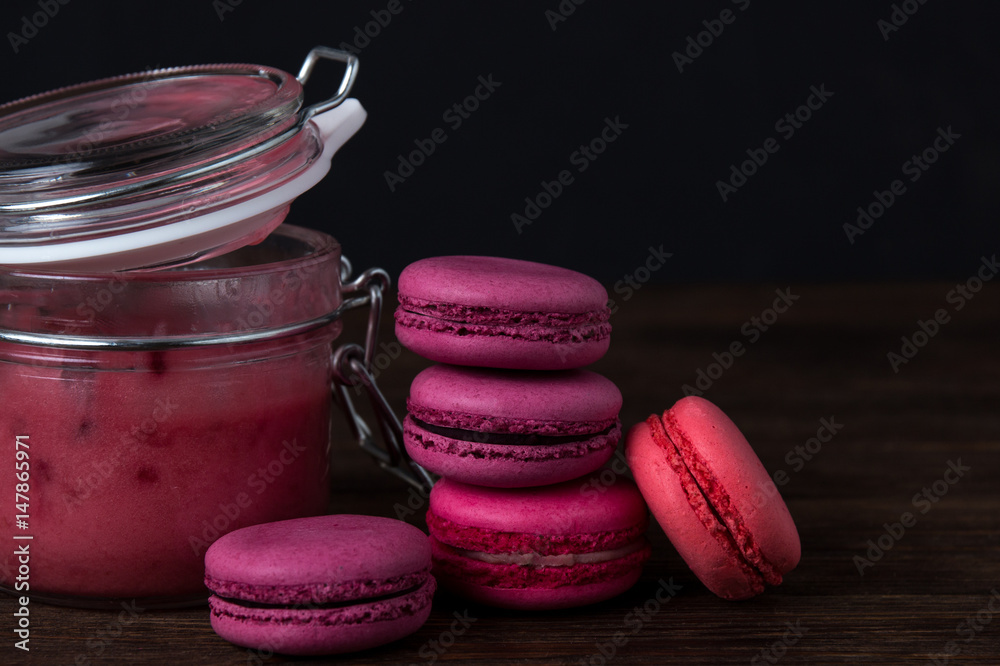 Pink macaroons with raspberry jam on dark wooden background. Berry macaroons on dark background