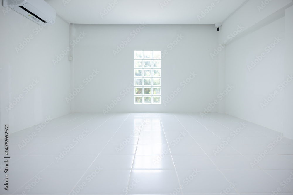 Empty room with square white tile floor texture pattern in perspective at day. Include glass block wall, air conditioner. Clean shiny surface. Modern interior home design suit for background.