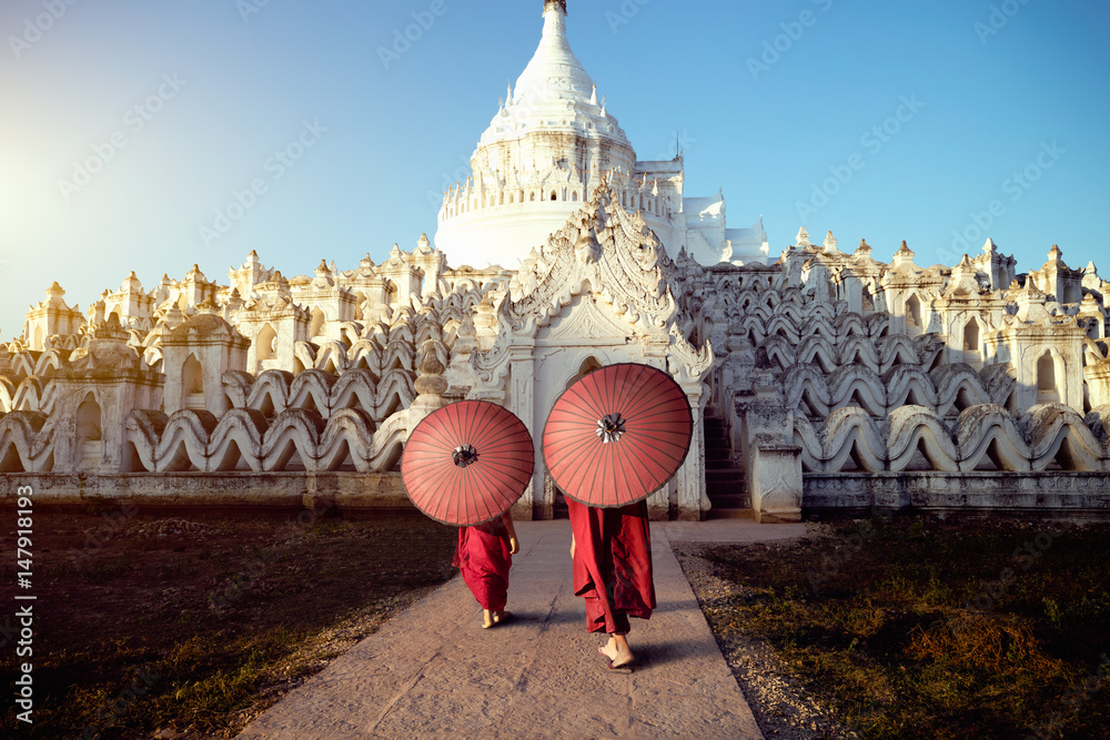 Novices under umbrellas at historic temple, Mingun, Mandalay, Myanmar