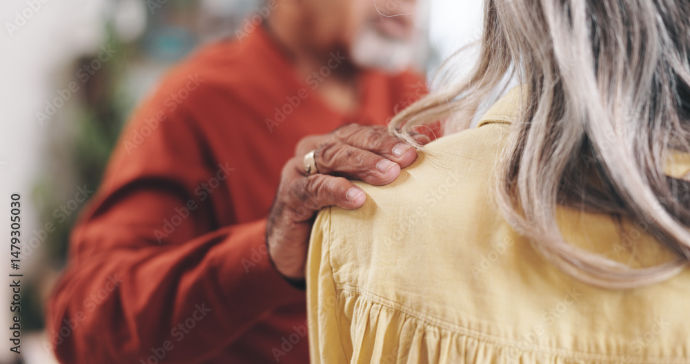 Home, old couple and hand on shoulder for empathy, support and comfort to partner with grief. Closeup, senior woman and elderly man with sympathy for loss, compassion and kindness with love in house