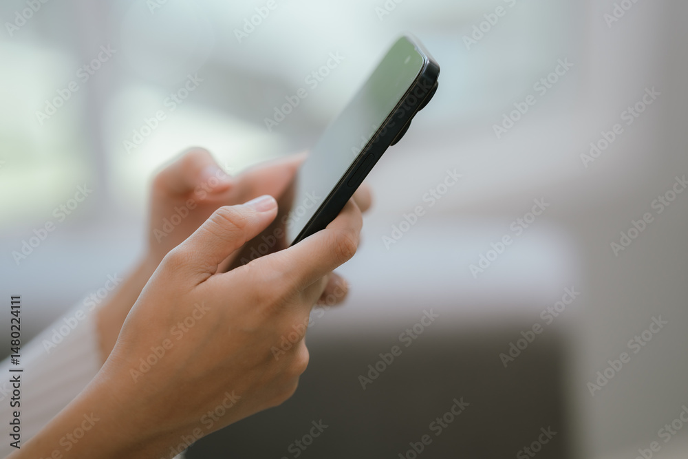 Close-up of a young woman's hand holding a smartphone and chatting on social media.