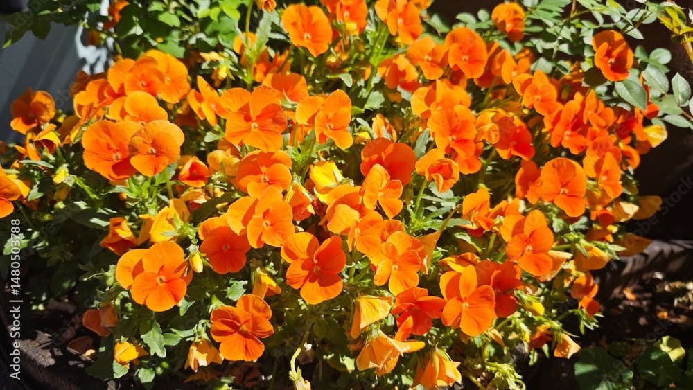 Cluster of bright orange pansy flowers in full bloom under direct sunlight. Concept of vivid seasonal beauty and vibrant garden life