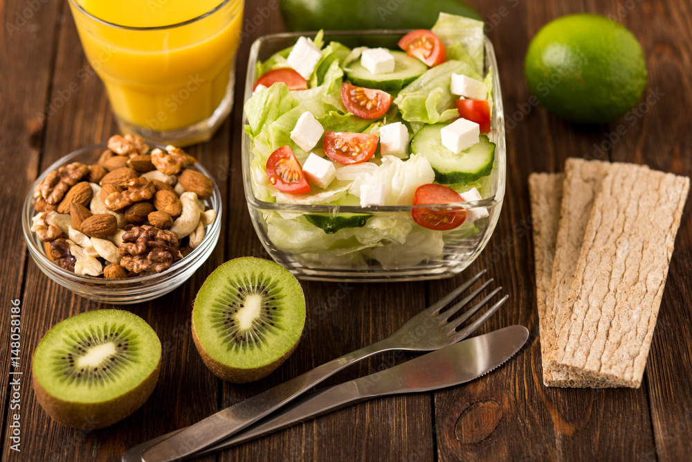 Fresh salad and fruits on wooden background. Fitness breakfast. Healthy eating, dieting, slimming and weigh loss concept.