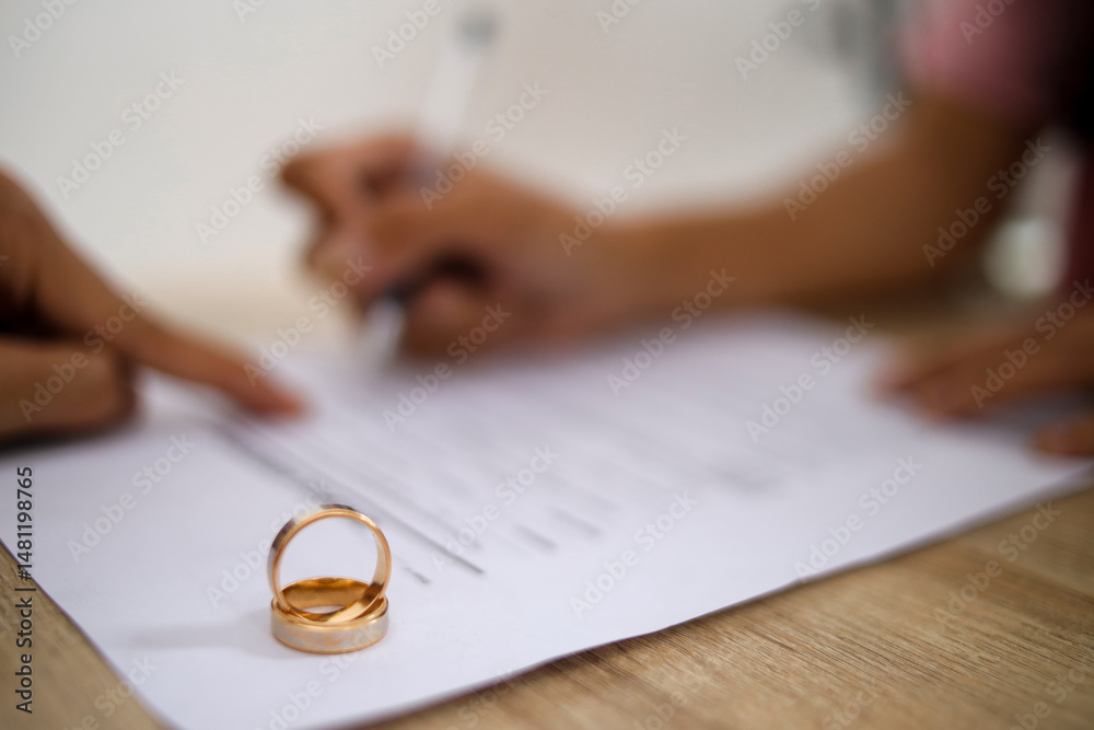 Wedding Rings Against Woman Hand Filing Divorce Papers or Premarital Agreement Prepared by Lawyer