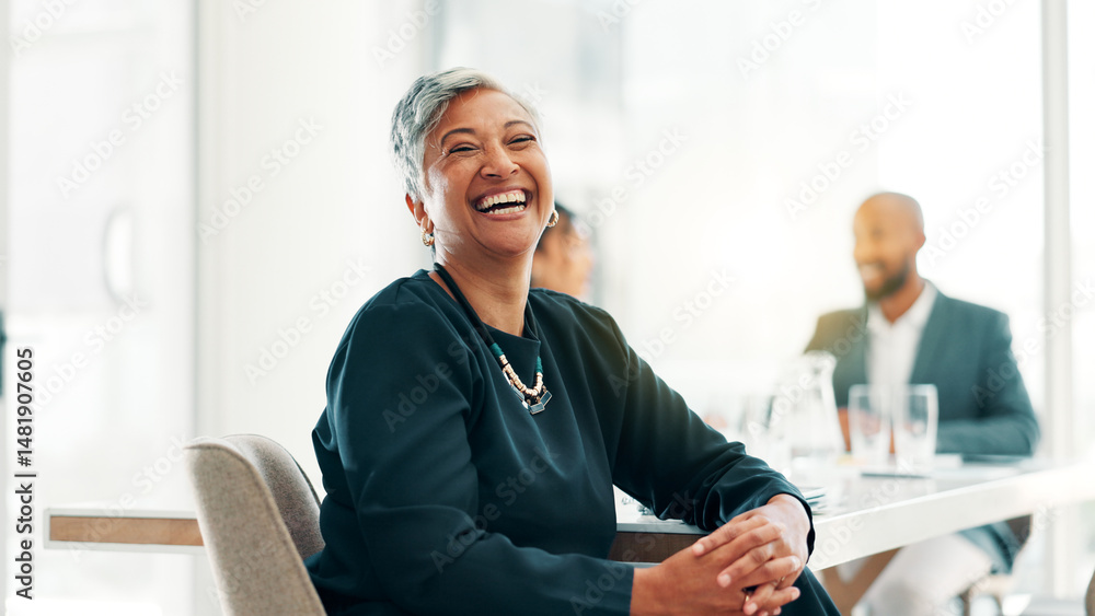 CEO, business and mature woman laughing in office for investment, venture capital and funny. Professional boss, executive and happy manager at work for private equity with experience for coworking