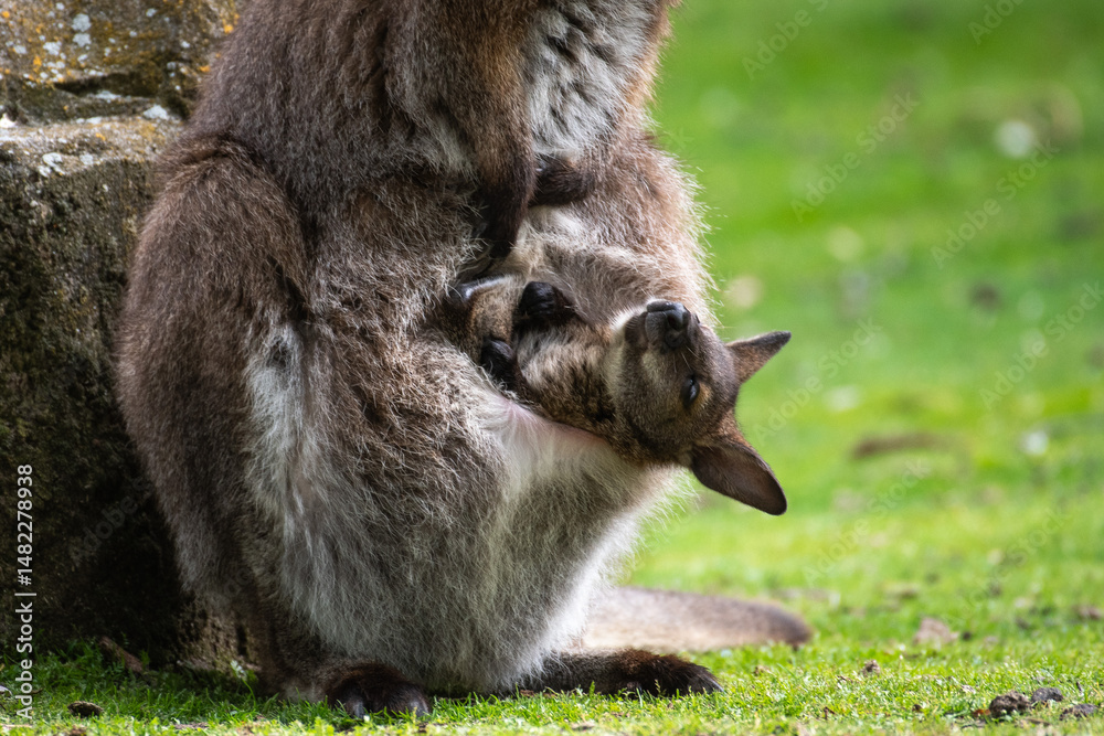 A cute joey of red-necked wallaby, Bennett's wallaby (Notamacropus rufogriseus) in the pouch of her mother