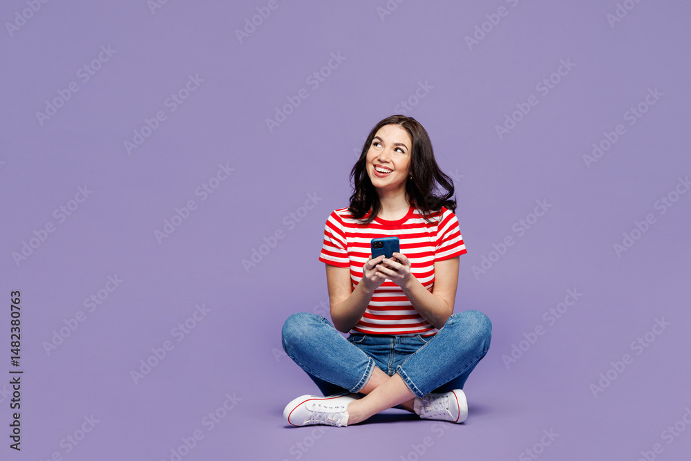 Full body young woman she wear red striped t-shirt casual clothes sit hold in hand use mobile cell phone look aside on area isolated on plain pastel light purple background studio. Lifestyle concept.