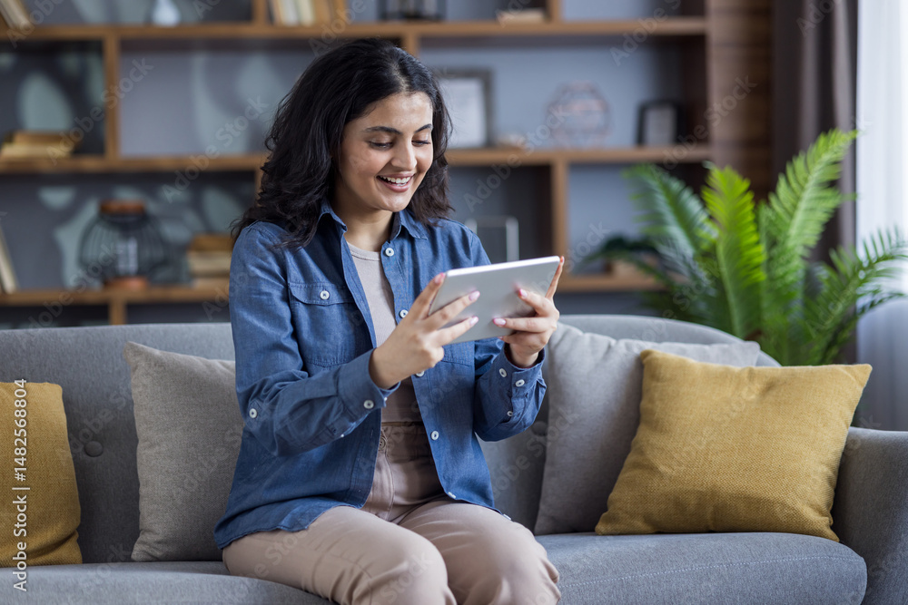 A cheerful young woman is engrossed in her tablet while relaxing on a comfy sofa at home.