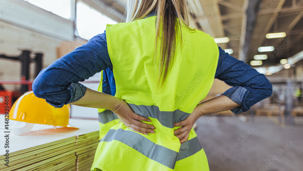 Construction Worker Experiencing Back Ache While Wearing Safety Vest and Helmet