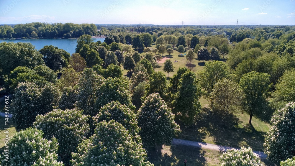 Aerial view of the lake and green trees, flowering chestnut trees in the park on a sunny May day.