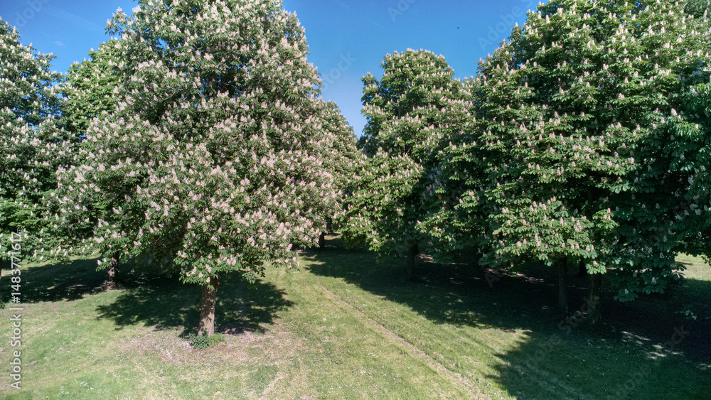 Aerial view of the forest with green trees, blooming chestnut trees in the park on a sunny May day.